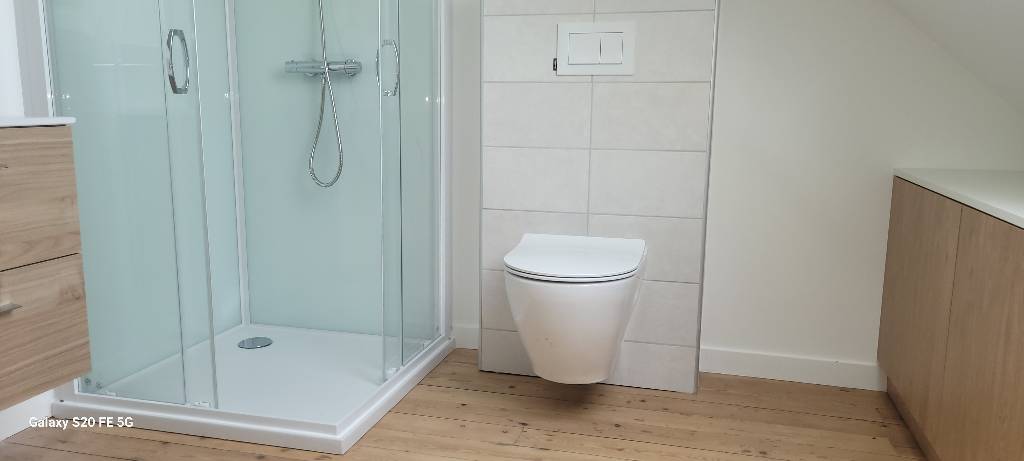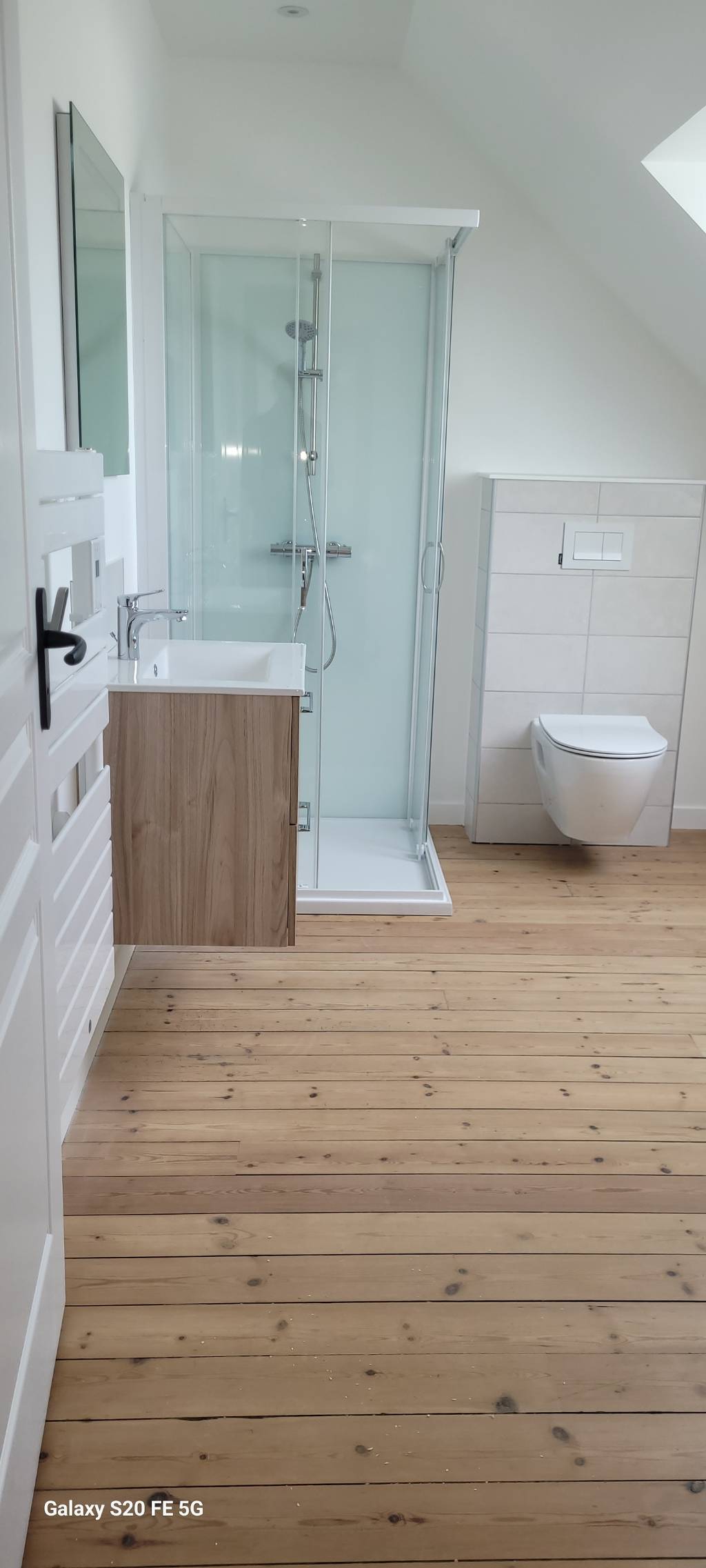 - Pose d'une cabine de douche intégrale Léda sur plancher bois