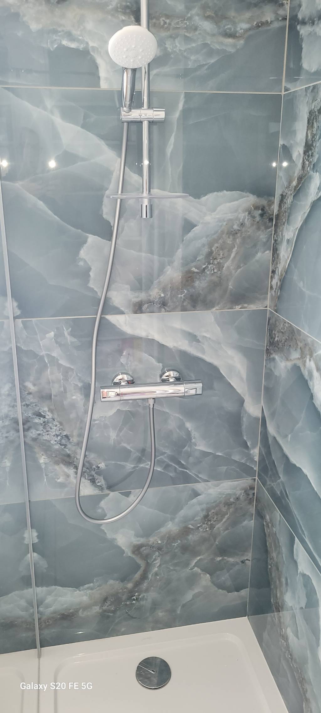 - Pose d'une douche 80x120 avec receveur Jacob sur dalle béton, mitigeur thermostatique, ensemble douche 3 jets et paroi de douche fixe Aquance